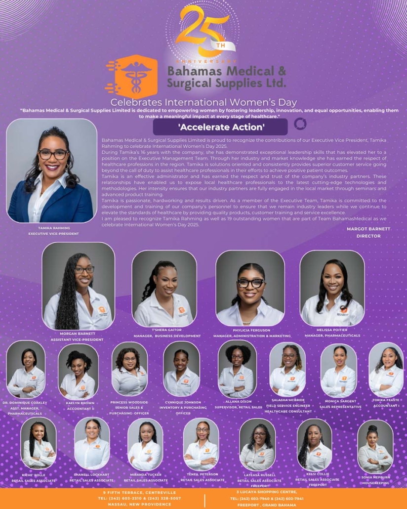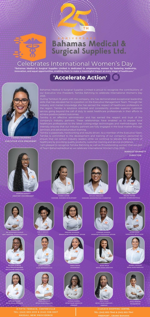 On March 7, Bahamas Medical & Surgical Supplies Limited proudly celebrates the strength, resilience, and remarkable achievements of women everywhere. 💜 Today, we honor the women who lead, heal, innovate, and inspire—especially those making an extraordinary impact in healthcare and beyond. Our commitment remains steadfast as we work to accelerate progress toward a future where every woman has the support, opportunities, and recognition she deserves. Together, let’s continue to uplift, empower, and champion women today and every day
